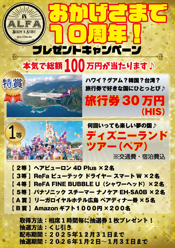 TOP NEWS LIST 豪華!10周年記念キャンペーン開始♪ 豪華!10周年記念キャンペーン開始♪ 2025.11.29 | News おかげさまでALFAも10年目を迎えました! 3年で7割の店がつぶれると言われる飲食業界で 10年も続けれられたのは皆様のおかげです♪ ありがとうございます!? 日頃の感謝を込めて豪華プレゼントキャンペーンを開催! 昨年度、海外旅行が当たった方はとても喜ばれてましたよ~ 今度はあなたが当てるチャンスです♪ Please follow and like us: 2025年11月 2025年8月 2025年7月 2025年6月 2025年5月 2025年4月 2023年12月 2022年1月 2020年3月 2020年2月 2019年4月 2019年2月 2019年1月 2018年11月 2018年10月 2018年4月 2017年11月 2017年9月 2017年8月 News
